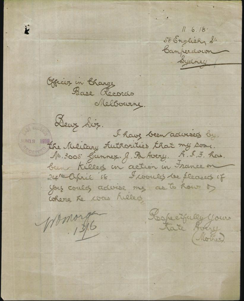 Letter from Kate Avery re her son Bede