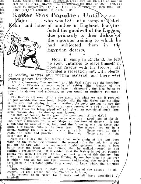 My father Milne Barry Gow served in the AIF, Second Division Signals during the First World War. He was one of four brothers all of whom served in the AIF and returned uninjured to Australia. Despite his being older than two of them he outlived them all by lasting till the age of 99 in 1992. He never talked about the unpleasant aspects of his war. I know he was in Egypt, England, France and Belgium. He recounted some amusing stories about his riding of motor bikes and also horses specially one that had the habit of biting its riders. Unfortunately, Dad left almost no record of his war period. Among the few bits and pieces,such as his dog tags and an AIF badge, I found a single issue of Reveille published in November 1931 in which there is an article by one of Dad’s mates, J Bombelli. This article, moreover, had been circled and is of importance to me when it is the only document I have concerning Dad’s war service. He was the digger ‘who was a good hand at sketching’.