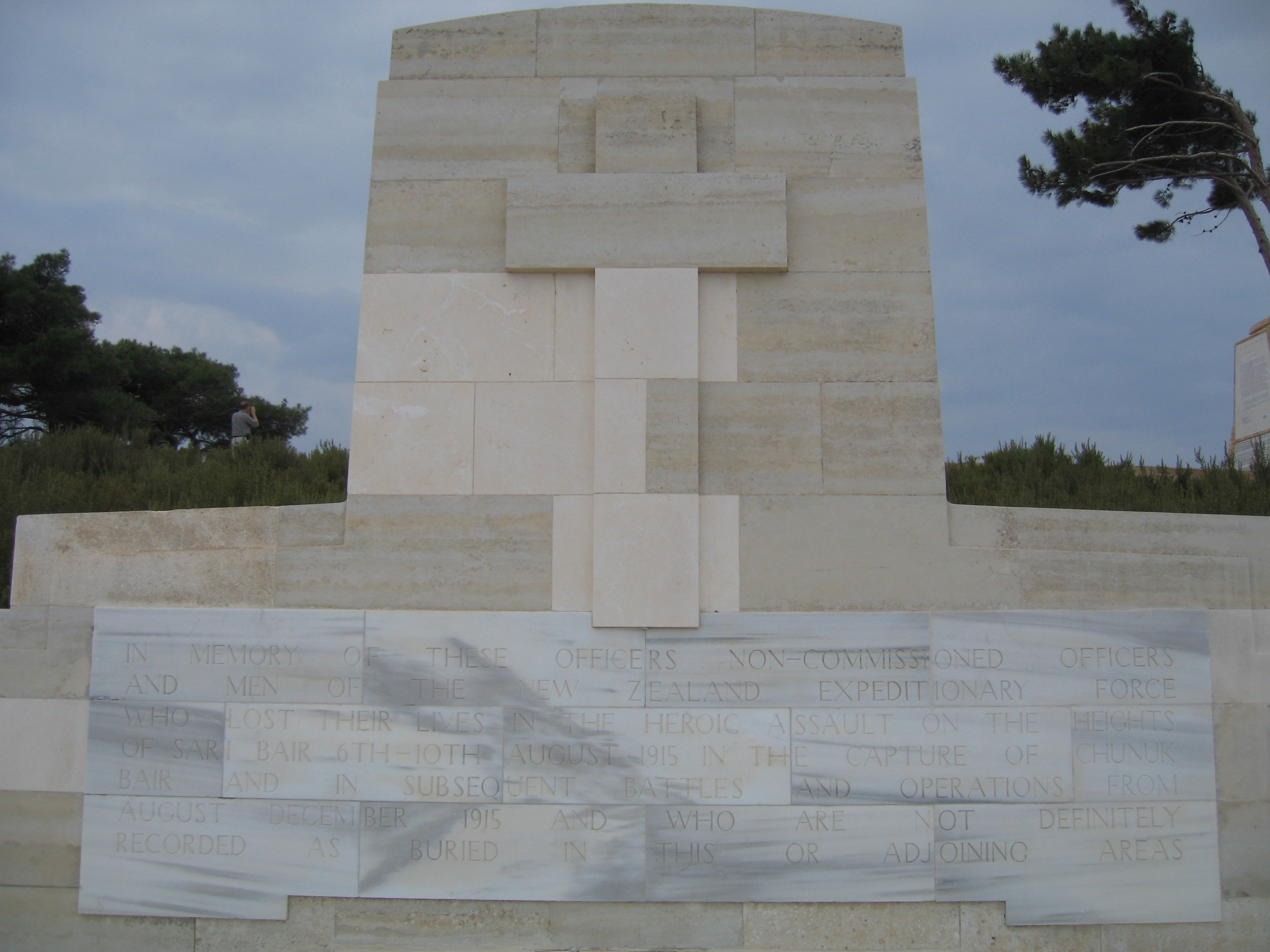 Memorial to the NZEF at Chunuk Bair. The Inscription reads ‘In memory of these officers non-commissioned officers and men of the New Zealand Expeditionary Force who lost their lives in the heroic assault on the heights of Sari Bair 6th-10th August 1915 in the capture of Chunuk Bair and in subsequent battles and operations from August-December 1915 and who are not definitely recorded as buried in this or adjoining areas. Image courtesy R O’Neale
